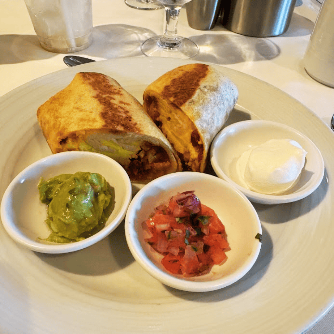 Leah ordered the breakfast burrito and loved it—it was a definite win. I went with the French toast, hash browns, and some fresh fruit. The French toast didn’t quite live up to the version we had on Oasis last year, but it still hit the spot.